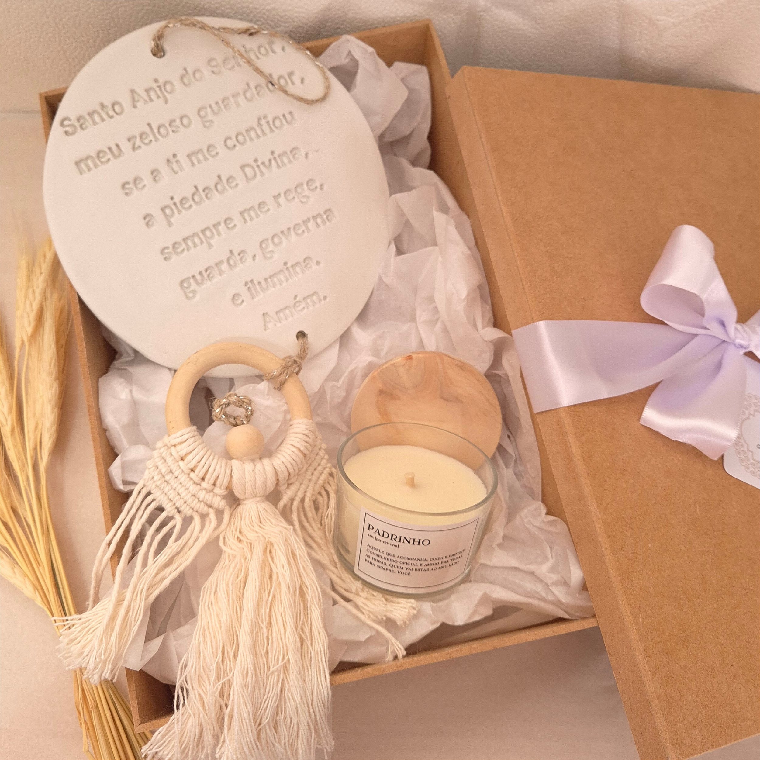 - Uma vela aromática de 100g no aroma cascas e folhas com adesivo personalizado com frase do significado do padrinho+ enfeite de porta em cerâmica branca com a oração Santo Anjo e macramê em formato de anjo.